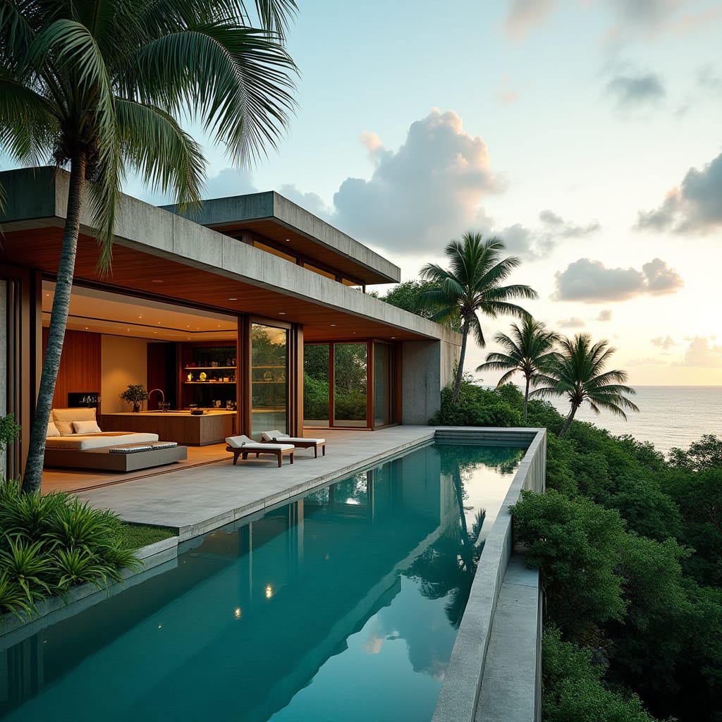 Main Architectural Elements: Linear concrete roof plate · Sliding full-height glazing · Integrated lap pool · Timber soffits · Deep shaded terrace