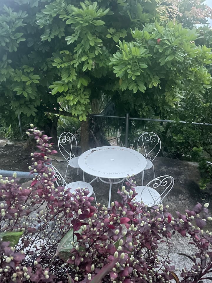 Step outside to a private garden with fruit trees and tropical plants, where a peaceful seating area invites relaxation. With a private entrance, enjoy the freedom to explore nearby attractions at your own pace.