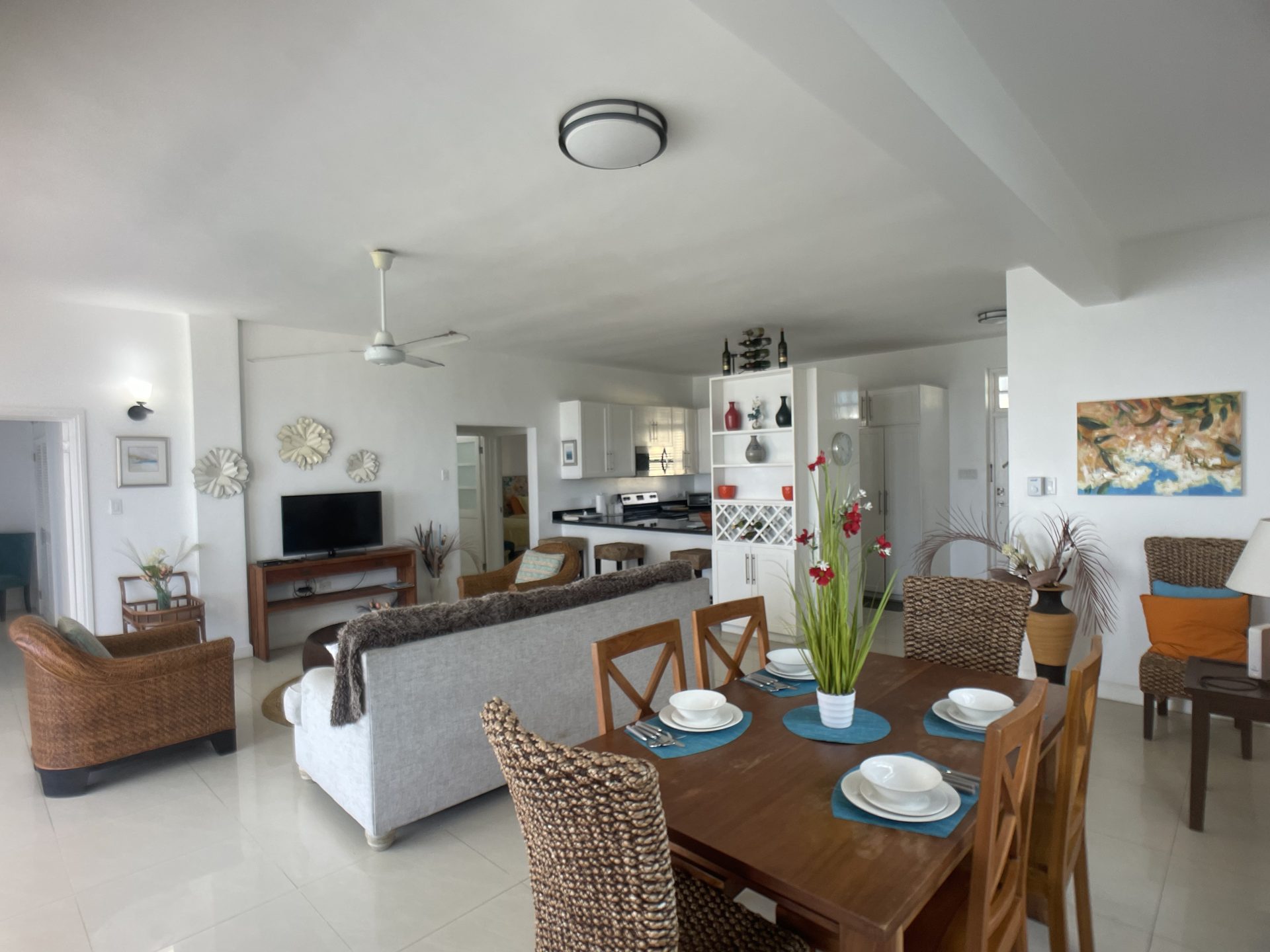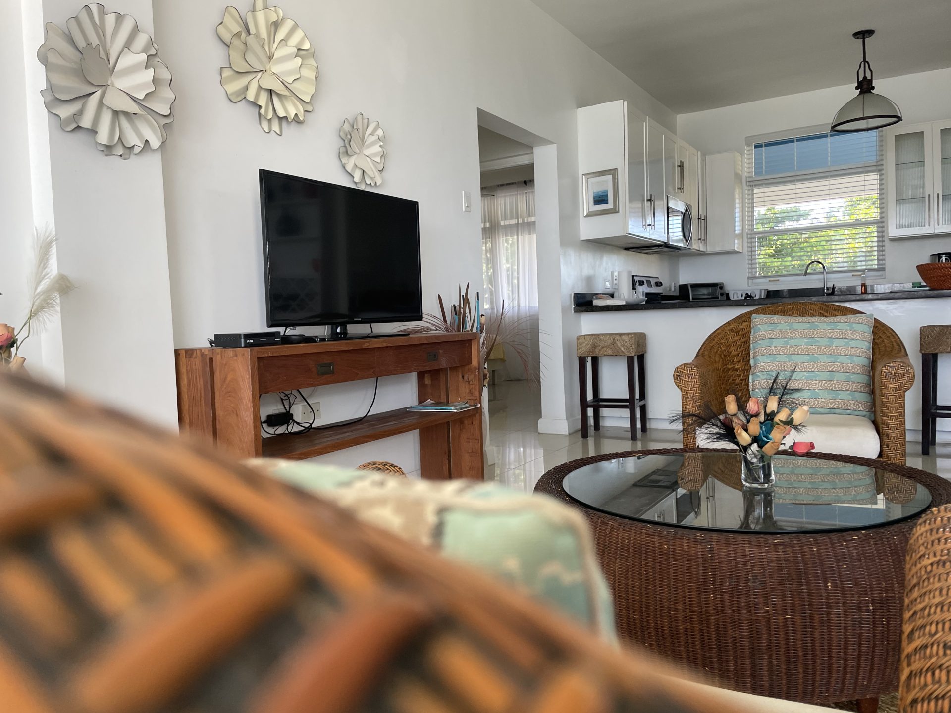 - Bright Living Room with a large TV for entertainment.