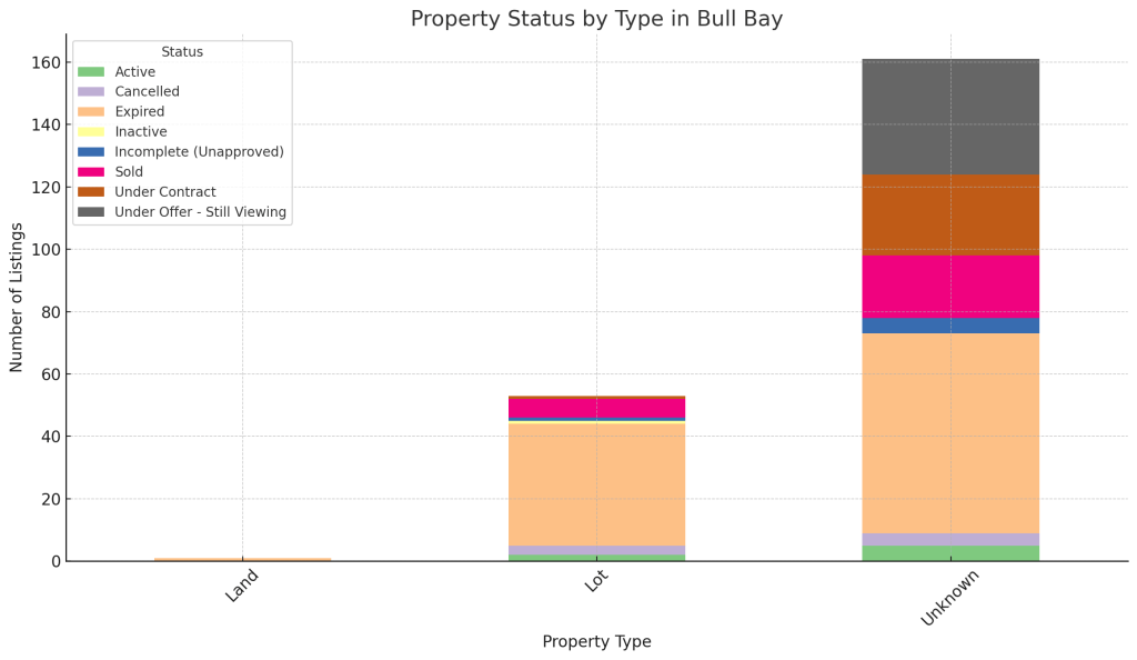 Bull Bay is showing a complex and somewhat sluggish real estate market, with a heavy tilt toward expired listings. Here’s a breakdown of the current listing status: