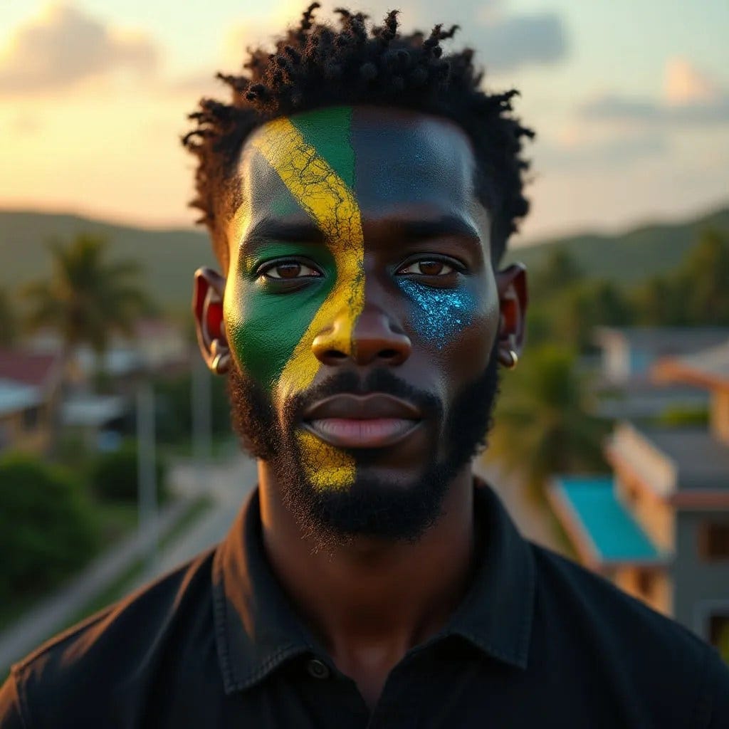 A Jamaican man is held frontally in a tight portrait, shoulders squared, gaze steady, carrying himself with the quiet confidence of someone accustomed to holding complexity without performance. The image divides his face cleanly, not as fracture but as alignment, with the left side rooted in present-day Jamaica and the right extending into a plausible near future. On the left, warm light settles across painted national colours that sit imperfectly on skin, allowing pores, lines, and texture to assert lived reality rather than symbol. Behind him, the residential landscape reads as ordinary and specific: concrete housing, zinc and tiled roofs, trees rising unevenly against hills, all held together by late-day light that softens but does not romanticise. On the right, the surface of his face darkens and flattens slightly, marked by embedded circuitry that remains restrained, signalling intelligence and infrastructure rather than spectacle. The future city behind him rises cleanly but recognisably Jamaican, its density and order shaped by planning rather than fantasy, with transport lines, solar rooftops, and vertical form integrated into the land. Subtle digital overlays hover without dominance, suggesting systems that observe, model, and respond rather than command. Across the frame, the transition from warm to cool light is balanced and deliberate, presenting continuity rather than rupture between place, person, and time.
