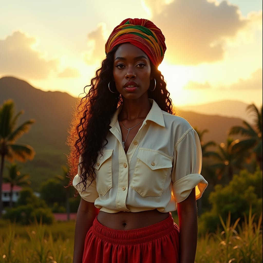 A tight close-up of a strong, resilient Jamaican woman, set against the vibrant, gritty backdrop of a bustling ghetto neighborhood, her face illuminated by a warm, cinematic glow, with subtle film grain and a slight vignette