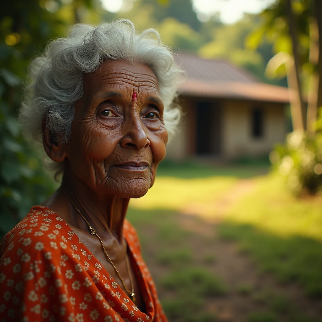 A young Jamaican woman, dressed in vibrant, eclectic clothing, with a bright smile, stands proudly in front of her beloved “yard”,